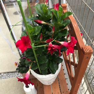 花屋さんで一目惚れで買ってきたリップギャル レッドNo.5🌷 花は咲いてくれてるんですが、イマイチつる性なのかどうかよくわからない💦 支柱意味あるのか?🤔