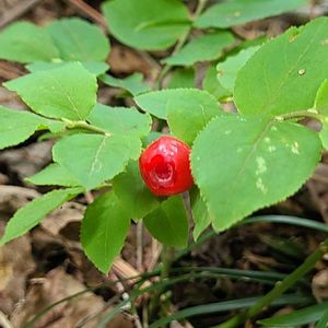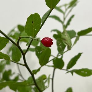 プチ登山にて。小さな赤い実❓のようなこちらは何でしょう。葉や茎の雰囲気はミニバラを感じさせます☺️ 2023.5 ウスノキの実と判明しました! 約一年後に分かりましたが、とっても嬉しいです💕