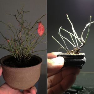 和茜さんで頂いたウスノキを植え替えました。株立ち状になっていましたが、ほぐしてみるといくつかの株に分かれたので、いろいろなサイズの鉢に分けました。これは豆鉢。