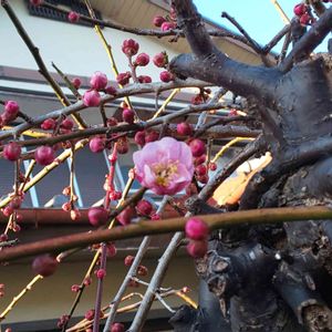 こんばんは(^-^) 実家の枝垂れ梅、やっと一輪咲いてくれました🥰 花が咲き終わるか終わらないかのうちに、枝をほとんど落としていた父の真似をして早10年。今年は例年より2週間ほど遅い開花です💕🤗