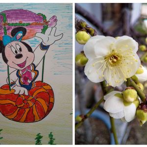 こんにちは。◕‿◕。 寒の戻りで寒い日ですね😊 主人の古希の記念樹、鉢植えの枝垂れ梅がやっと開き始めました🤗 ←孫の好きな絵を描いて 主人は楽しんでいます。