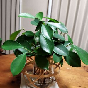 ガジュマル君です。 何年か前に、雑貨屋で主人が一目惚れしてうちに来ました。 何度か植え換えをして、あまりに葉が伸びすぎたので、切ってみました。 これで幹がもう少し太くなってくれるかなって🤔 問題は切ってしまった枝です。ガジュマルにはキジムナーという神様が宿っていて木を粗末に扱うと天罰がくだると言われているらしい。🤨 迷信から枝が捨てられずに花瓶に挿しています。 すでに根が伸びて来て、さらに捨てられない状況です。😔