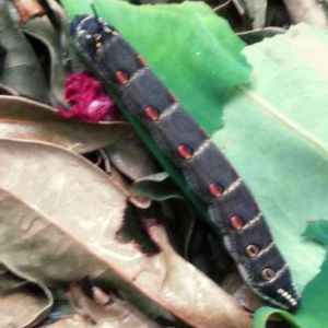 おはようございます! サトイモの茎に こんな イモムシくん!10センチ以上ありますが、どんな蝶になるの? もしかして 蛾?