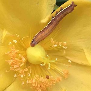 今が盛りの金糸梅に カラーコーディネートした芋虫🐛💛 ☺️GS折句😊 3日目です。🙋🏻♀️ キ キミはだれ? ン ン〜ステキ❣️ シ 白いラインと バ バッチリ決めた イ 粋な縦縞 risho さんから 「コモクメヨトウ」と教えていただきました。🙇🏻♀️ 皆さまGS折句にチャレンジしてみませんか。🤗 2020.6.6 撮影 ☺️GS折句😊 6.7を見てください。