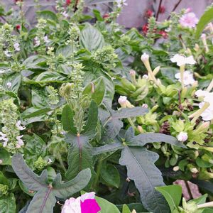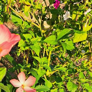 オシロイ花&バジル&ローゼル、片隅にアベルモスクス 🌸 色々な花のそばで、負けじと増え続けるバジルです🤭