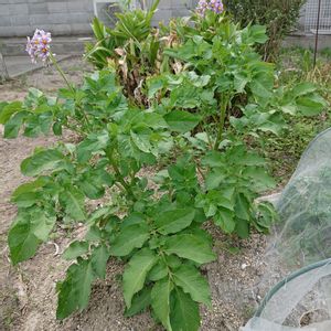 しっかりお花まで咲いてるじゃが芋。 こぼれ種。ではなく放置小じゃがいも。 指先くらいのちっさなじゃが芋を捨ててたつもりがしっかり育ちゃいました😆 🤭掘るの楽しみ!