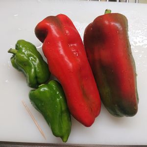 久しぶりの畑へ🤩 食べた種からのパプリカがガンバってます❗ 普通のピーマン&つま楊枝。 からの長細いパプリカ。 緑のパプリカがまだまだ成ってます😆 がんばれーやっほい🙌