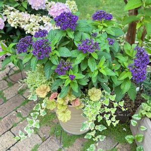 暑さが続きますね🫠 熱中症には気をつけましょう🍀水分補給は欠かさずに… ①② 先日の雨に負けずヘリオトロープ ブライドブルー(PWアンバサダー2024)が綺麗に咲いています💜 アイビーがいい垂れ下がり具合です🥰 ③ ラグランジア クリスタルヴェール(PWアンバサダー2022)の色が抜け始めて来たので今日少し切りました✂️ ④⑤ ヘリオトロープとヒューケラ バタークリーム(PWアンバサダー2021)はお似合い🥰(7/18撮影)