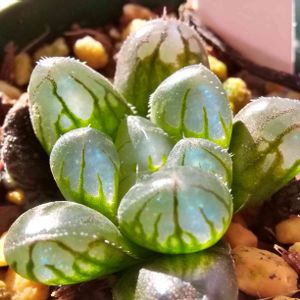 玉手箱とスペルバウンドの交配苗 スペルバウンドは緑の部分が光の加減で白っぽいと言うか粉っぽく見えるのですがこの子の緑の部分はしっかり緑です。なのに窓の部分が表面白っぽく見えるんですよね。白いというよりマットな質感で白っぽく柔らかい印象というか。結果トレーの中では白っぽく目立ちます。 丸い葉っぱに玉手箱の質感の窓でちょっと気になってます。