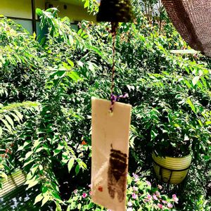 実家終いで見つけた風鈴 短冊を付け替えて吊るしてみた チリンともいわない まだ31℃ 水撒き待っててね、、、