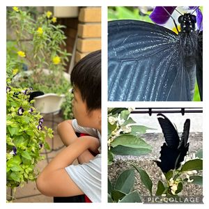 「トレニア」「クロアゲハ」 10月2日に撮ったpicです。 幼虫から飼って、サナギになり、 羽化したクロアゲハです。 孫に見せて、逃してやるのに、 蝶が外に出たところです。 トレニアの蜜を一生懸命吸っています。