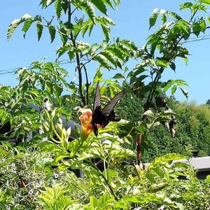 庭のノウゼンカズラ 終わりかけの花に、おっきなクロアゲハが 夏も終わりますね