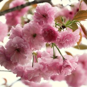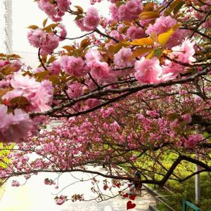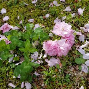 春の嵐① 八重桜が、満開のはず…。昨夜の雨風でどうなったか心配しながら、桜の木のある道を通りたくて、早めに出勤。 強風で、少し落ちていましたが、 大きな毬をゆらゆらさせていました✨