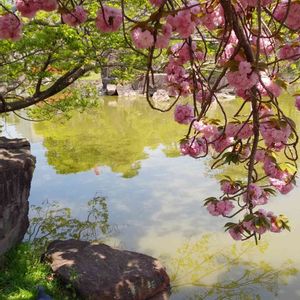 おはようございます🤗 🌸八重桜🌸 水辺に映る木々が綺麗です✨ よく見ると鳩🕊️さんもお花見に来てます🍀