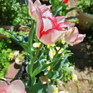 チューリップ🌷 コップ咲き ビューティートレンド 赤い縁取りが可愛い 子達~😌🌷💓 ビオラも優しい彩りを添えてくれたね~✴️💛✨🤍