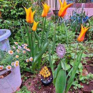 チューリップ🌷 とんがりさんは この場所に定着 毎年咲いてくれます✨✨ なんとなくアリスの雰囲気が合いそう 💚💛💙❤ 小物をあしらいました~💓♥️❤️