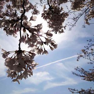 近所の桜🌸をチェック。 見頃の木もあるけど、まだ3部咲きの木も。 空には飛行機雲🛩️ 明日は大荒の天気だとか。