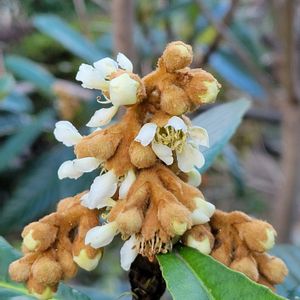 "今日のお花 ビワ" 散策路沿いの庭先。 可愛いお花が咲き始めていました(①~③)。 美味しそうな実は去年のpicです(④)。 📷️ 2024.12.4、2023.6