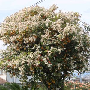 "白い水曜日" 散策路沿いの庭先。 立派なピラカンサの庭木に白いお花がびっしりと咲き、甘い香りを放散していました。 📷️ 2024.5.4