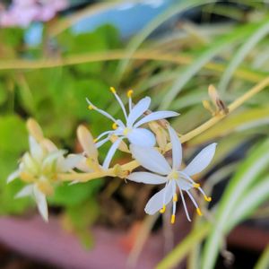 "月曜日を爽やかに" 散策路沿いの庭先。 オリヅルランが爽やかに咲いていました。 📷️ 2024.6.上旬 オリヅルラン(折鶴蘭)はキジカクシ科オリヅルラン属の常緑多年草。 観葉植物としてよく栽培される。 ある程度成長すると細長い花茎を高くのばし花穂をつけ、白い花が複数箇所でまばらに咲く。 この株の様子が折り鶴に似ていることからオリヅルランと名付けられた。