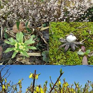 桜のような淡い梅の花の間に鳥🐦 この前「実はウグイスが梅の花に留まっているところを見るのは稀」と見ましたが、結構同じ鳥(ヒヨドリかな?)が留まっているは見かけます😃 嘴が届く鳥が花の蜜を吸うとか、雀は吸えないから花ごとちぎるとか聞いた事があります(笑) 蕗の薹をみつけました。 ちょっと薹が立っているかな? あと、ツチグリと黄色い花は調べたところレンギョウかな?