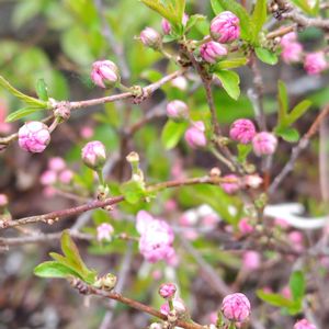 ニワザクラ(庭桜) 花言葉は「将来」、「心の美」、「淡白」、「優れた美人」、「うつろいやすい愛」、「高尚」、「精神美」、「愛国心」、「純潔」、「気まぐれ」、「秘密の恋」など。 4月2日の誕生花。 特徴 株立ちの樹形、葉は細い卵形で先端が尖る、葉縁には鋸歯がある 花 4月上旬頃、葉に先立ってあるいはほとんど同時に、葉腋に5弁で淡紅色の花を開く 品種 栽培される多くが八重咲きの品種で、結実しない