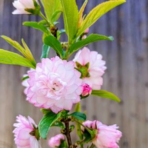 夜のひと雨もあがり、曇り空 蒸し暑さを感じます😥 鉢植えのニワザクラ(庭桜)も 小さな蕾から一気に開花しました🌸🌸🌸 小さいながら幾重にもの花びら🥰 こちらは3年目🌱 庭梅は☔で散り⤵、ニワザクラも花弁が散り始めたものも…。 短い花期ですが、やはり開花の様子はワクワク💗🤗🍀します