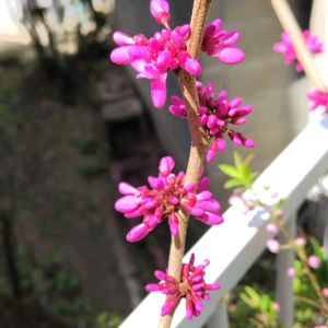 裏庭のハナズオウ(花蘇芳)💓💓💓 ショッキングピンクの鮮やかな花色です💖 近くには優しい色の庭桜も咲いています❇️💮❇️