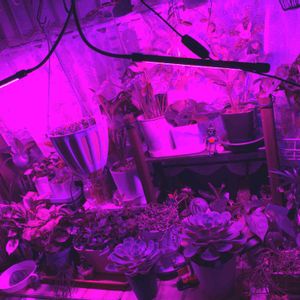 長雨が続き…… 大切な七福神様も室内に避難⚠️ 観葉植物さん達とご一緒に昔買った育成ライト‼️付けて見ました🤣 部屋中真っピンク💦💦 そしたら息子に外から見たら怪しい部屋に見えるから辞めて!と怒られました。😅😅 そりゃそーですね、すいません💦