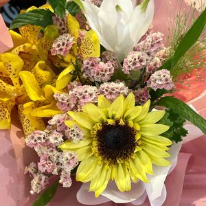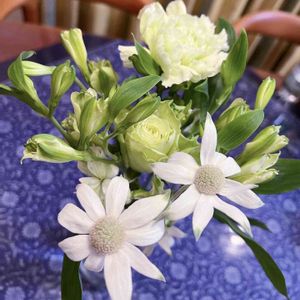 退院祝い🎉のお花 男性なのでシックになりました🌼🌿 白薔薇 アンバーダブルモヒート スターチス ナズナ ブルーベリー シャクヤク などなど🌼
