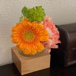 お出かけ先に日比谷花壇があったので、500円のミニブーケを買って帰りました。 ビタミンカラー。