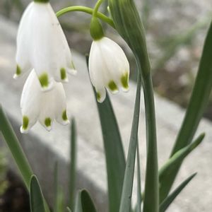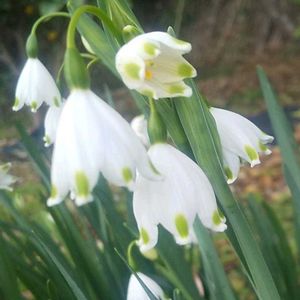 春の散歩で 【スノーフレーク】 スズランによく似た白い花を咲かせ、花弁の先のほうに緑色の斑点があります。葉は細長く伸び、葉色は少し白っぽく粉が乗ったような薄灰緑。別名は花をスズランに、葉をスイセンに見立てています。花は可憐な印象ですが、とても丈夫で大株になり半日陰でも花を咲かせます。終わった花をそのままにしておくとタネをよくつけます