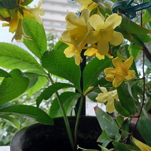 こんばんは😃🌃 今日も一日お疲れ様でした<(_ _*)> 今日のベランダ🎵 気がついたらカロライナジャスミン💛 咲いていました😆💓 外から見て気がついたのですが😅😄 今年はちょっと失敗したみたいで お花が少なく綺麗に撮れないので なんとかクリローさんの葉っぱにカバーして貰ってパシャリ📷 今年で15年目まだまだ頑張って欲しいです~~♫(*´▽`*♡※。.♬:*:・♪'°☆~