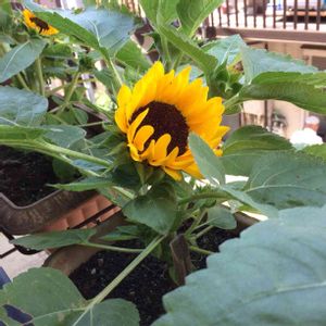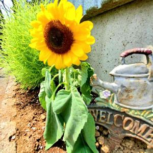職場の入り口のミニひまわり🌻 草丈20cm 花径8cm ちっざい💕 小夏(矮性種)かも 大家さんが水をやり忘れて?ちょっと可哀そう💧💦