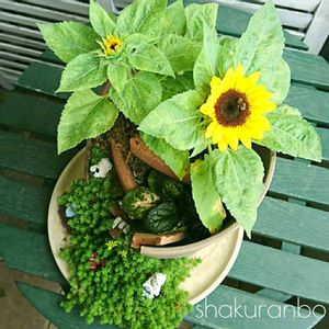 ~割れ鉢🌻夏 version 2018~ 種子から蒔いた小夏ちゃん 咲いてくれました! 身の丈10㎝ほど 昔からある大きな向日葵は 怖いからね~ これくらいがちょうどイイ 💚セダムも溢れてる アジュガのランナーも 挿してみました 根付いたようです❣️