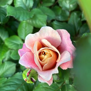 こんにちは🟦 どこに佇んでいても 清々しい庭✨ 薔薇🌹 少しずつ開花〜✨•.°*•.*•🧡 例年よりも ゆっくりです😊 ①四季咲き🪴 ディスタントドラムス🇺🇸 ベージュ色をベースに ピンク〜薄紫色などの彩りが 何とも魅力的🧡💖 ②つる薔薇 ロイヤルサンセット🇺🇸 強く漂うダマスクの香りで 開花に気づきました•**♡ 優しいオレンジ色🧡 ③つる薔薇 四季咲きカクテル🇫🇷 鮮やかな赤に 中心が黄色♥️💛 一重咲き