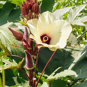 オクラ ①② 赤オクラ ③ オクラ ④⑤ キバナコスモス 赤オクラ、実は赤いけど、花は同じだね。 同じ場所にキバナコスモスも咲いて。