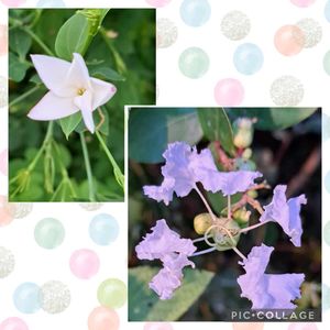 おはようございます😊 近所に咲いていた 💜百日紅 🤍桔梗?かナ 暑くてあまりお花も 咲いていないわ(´❛-❛`)