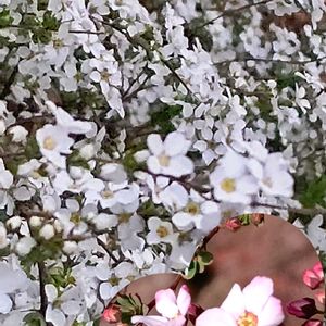 今日のお花❀.*・゚ *ユキヤナギ(雪柳)ᰔᩚᥫᩣ 今朝、満開の庭のユキヤナギとご近所さんのピンクユキヤナギ