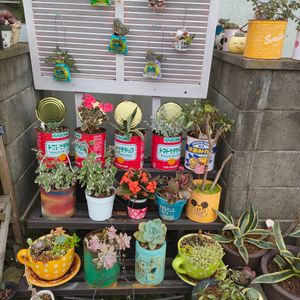 おはようございます♡ 一昨日の休みにやっと植え替え出来ました✌️ 並べ方バラバラ😓💦 業務用のトマト缶もらっていたので何とか出来たぁー🎵 きちんと植えついたらまた配置換え🎶