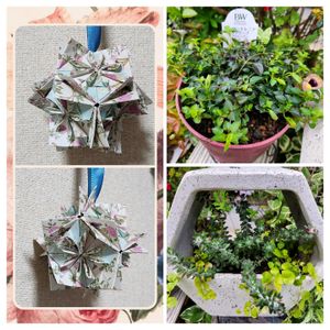 おはようございます🙇 植え替えの記録 *スーパートレニア.カタリーナラムレーズン *もふもふ、ポーチュラカ.ウェルデルマニー 新作のくす玉🎊、6枚で出来上がり。 二方向から撮ってみました。