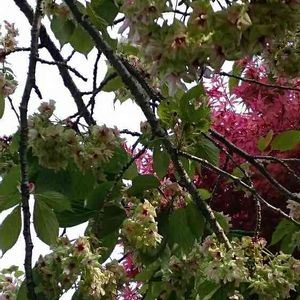逆光ですが、わかりますか❓ あった〜❣️ 緑の桜‼️ しかし札が落ちていてこちらの木が、御衣黄なのか、鬱金なのかは不明😅