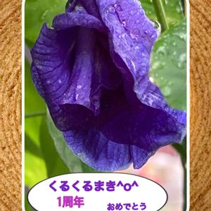 八重咲き バタフライピー 初めて育てて沢山感動をいただいた花です シズクを纏って美しい一枚です💜 来年も育てたいお花です💜 くるくる焼き あっ違った🤭 ㊗️くるくるまき^o^ 1周年おめでとう🍷🍷🍷 たくさんのくるくる🌀楽しみです