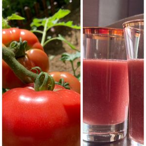 100%トマト🍅ジュース🥤 ヘタ以外をハンドミキサーで ブーン & あら目のコシ網で濾して(絞りカスはほとんどなし) おまちどおさま 夏の朝のいっぱい🥤です