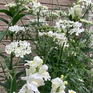 白い花ばかりの花壇 全てこぼれ種 ⚪︎オルレア ⚪︎キンギョソウ ⚪︎ノースポール