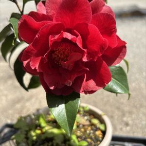 暑い陽射しの中で細い枝に、真っ赤な大輪の花が咲きました。
