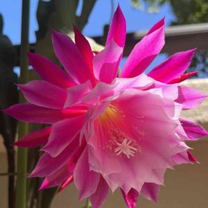 こんにちは。 久しぶりの投稿です。 気づけばもう6月☔️🐌 6月に入り3年前に挿したクジャクサボテンが、やっと初めて花を咲かせました。 サボテンの花って、本当に大きくて見事で驚きます。 デッキの上で育てていたので、葉がナメクジに食べられて穴だらけ。 原因が分かったので、最近ナメクジ駆除をはじめました。