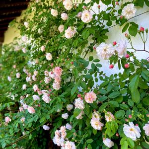 今晩は☔︎ 南のナチュラルにガーデン 古住居の古板塀に誘引してる ピエール・ドゥ・ロンサールtwinsister's 開き始めの今が何んたって1番可愛い(๑˃̵ᴗ˂̵) 西のワイルドガーデン つる薔薇・コーネリア 🐃牛小屋裏漆喰白壁誘引だけじゃ収まらず 前のバーゴラにも誘引 まだまだ伸びしろ未知数デス🤣 ちょびっと見えてるのはクレマチス・アラベラ ♪(๑ᴖ◡ᴖ๑)♪