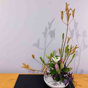 ユリ3種(ドライ実・生実・花)を使って和風にいけてみました。 足元には、紫ツユクサで彩りを添えて。(ピンクの花が可愛い・・・(^^)
