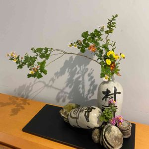 昔の酒瓶を使って、乱れ菊の意匠花です。 実家の庭の片隅に埋れていたやきもの(お茶碗?お皿?)の焼き崩れた物(失敗した物)を添えて。